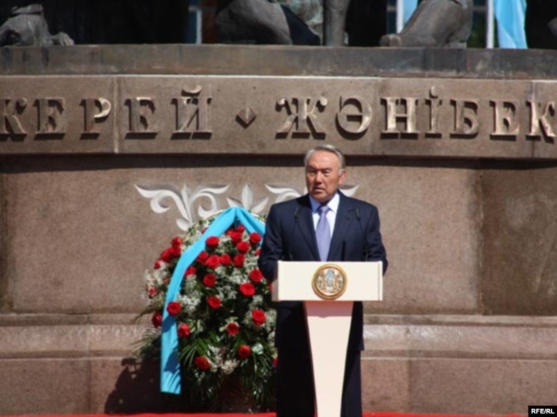 Президент Казахстана Нурсултан Назарбаев выступает с речью на открытии памятника ханам Керею и Жанибеку. Астана,1 июня 2010 года.